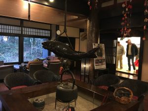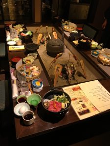 The resort provides yukata, tabi socks, and toiletries. Dinner is served nightly across a swing bridge that crosses the river! Robin Kidder - December 2017